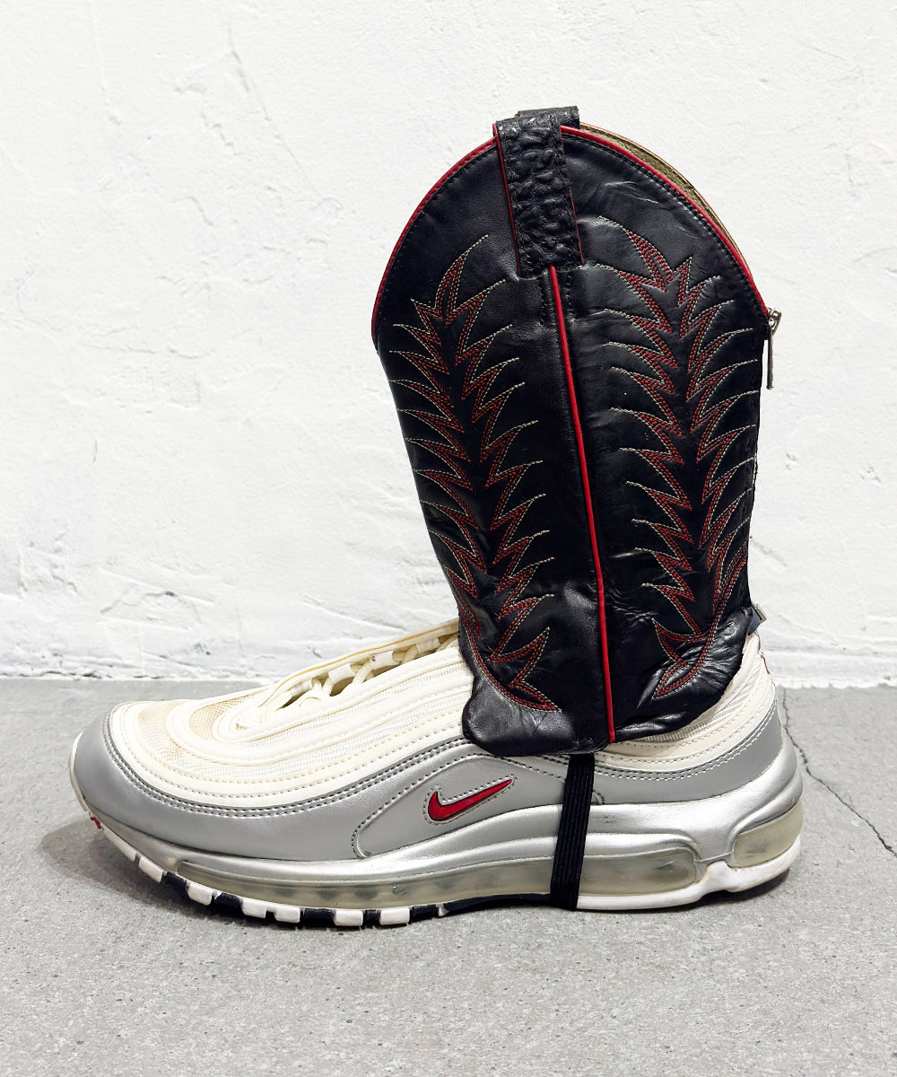本来のブーツデザインに宿る重厚なカウボーイディテールをそのまま活かしつつ、サンダルやスニーカーに合わせて装着できる仕様にアップデートされています。