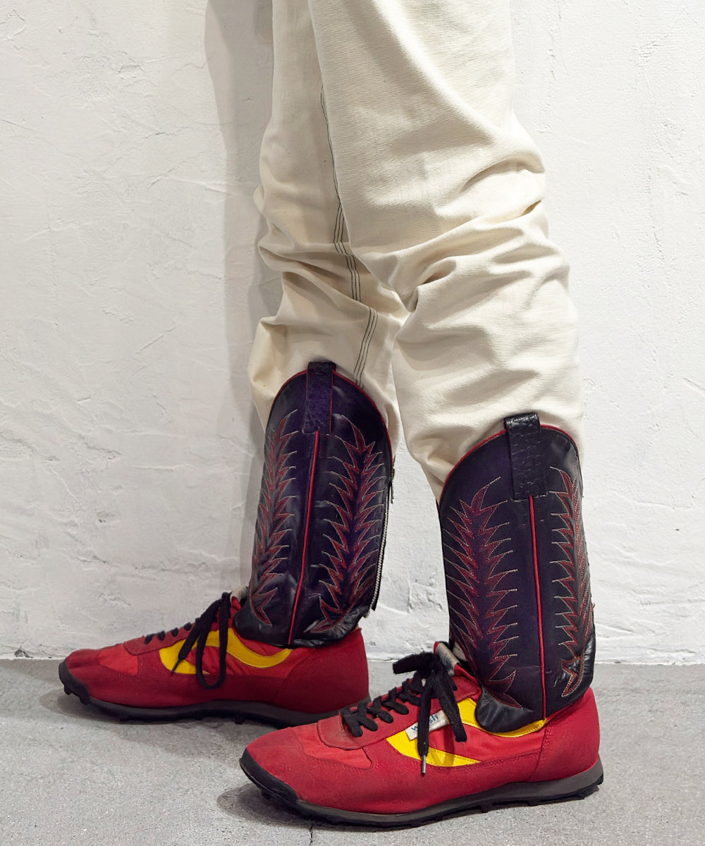 クラシックなウエスタンブーツを大胆にリメイクされた、レッグカバーとして再構築したユニークなアイテム。