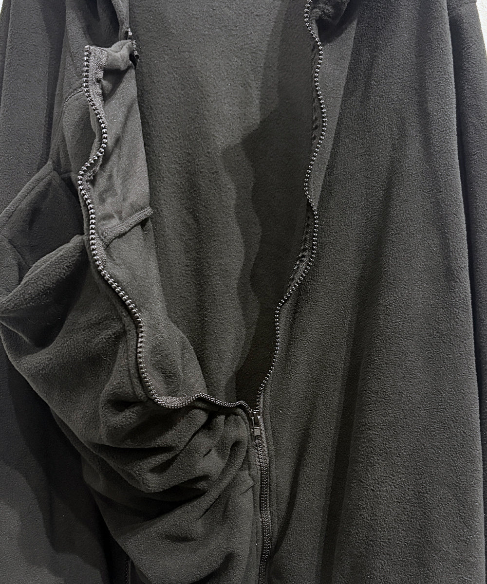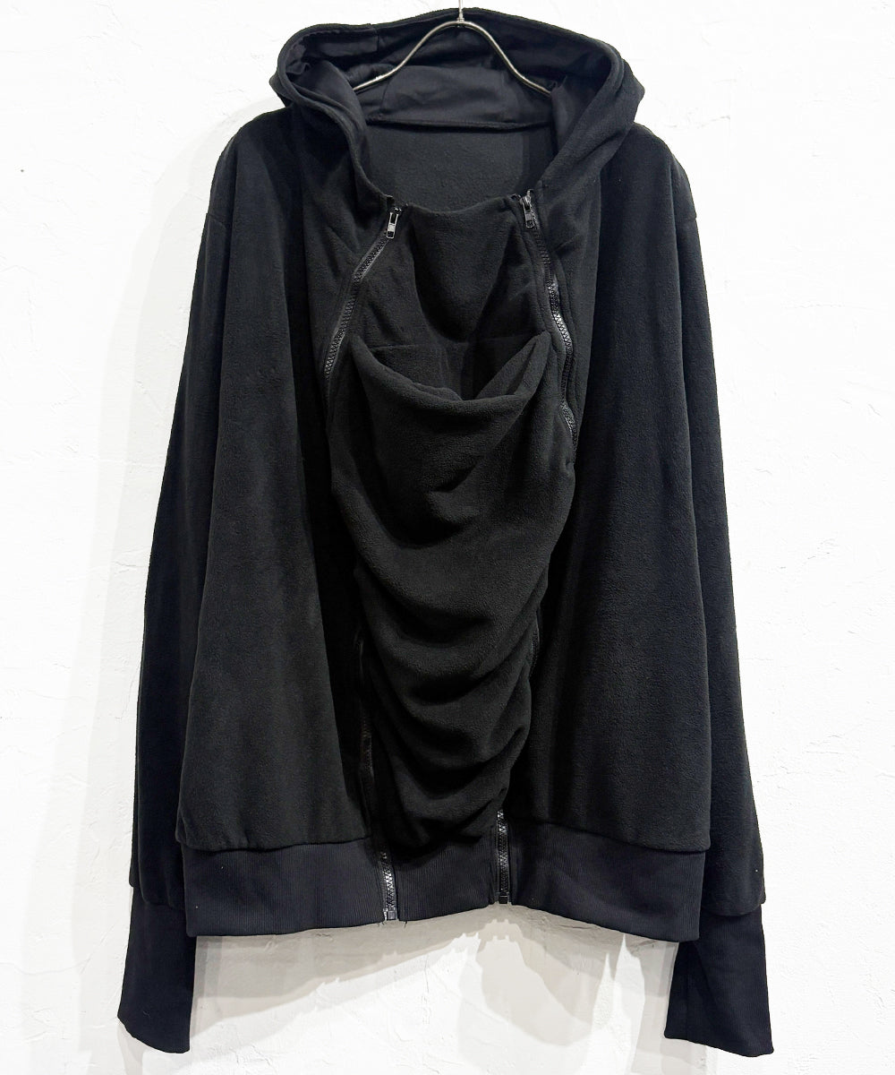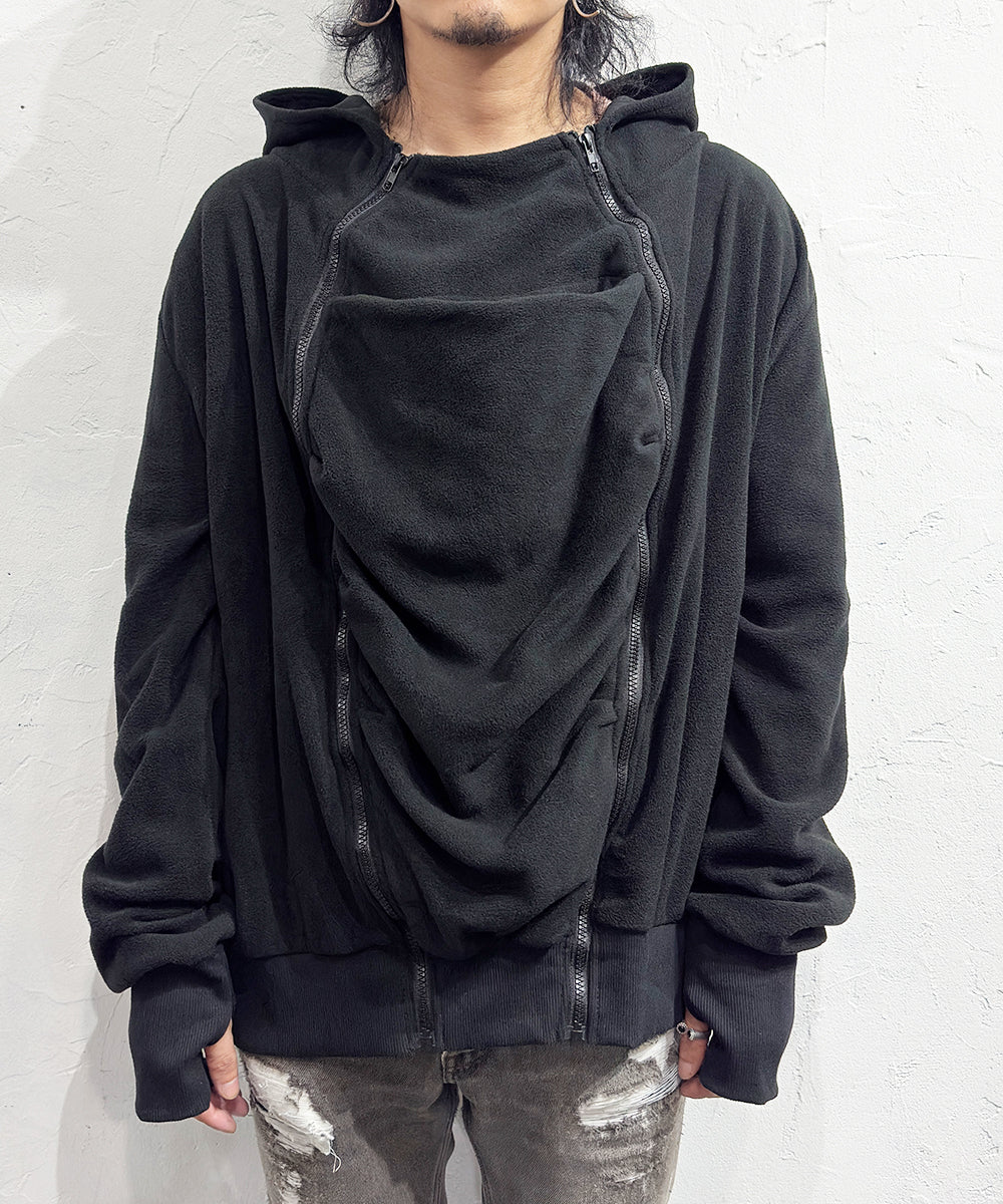 フロントに施された大胆なドレープポケットと2本のジップが印象的な、エッジの効いたフリースフーディ。